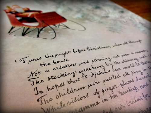 We didn’t ever read it any other time of the year. But once a year it would come down from the book shelves. And we’d read a little here and there. It still holds up as a beautiful book to be enjoyed over the holidays. Clement Clark Moore’s Twas the Night Before Christmas was a favorite in our house. Last year my father sent Emily a package to be opened before Christmas, he told me it would make me cry and sure enough it did. He had recorded himself reading this story and sure enough it got me. And it tore me up all over again to read to Emily from the book we had read from so long ago.