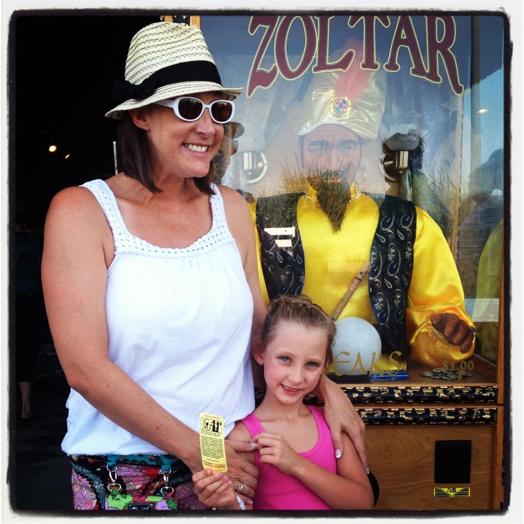 Zoltar told us our fortune. We piled in a photo booth and had our pictures taken. We ate ice cream cones and greasy pizza for dinner. We went on the Gravitron and laughed as our arms turned to lead. The Freefall had me hysterical. The bumper cars did not let us down.