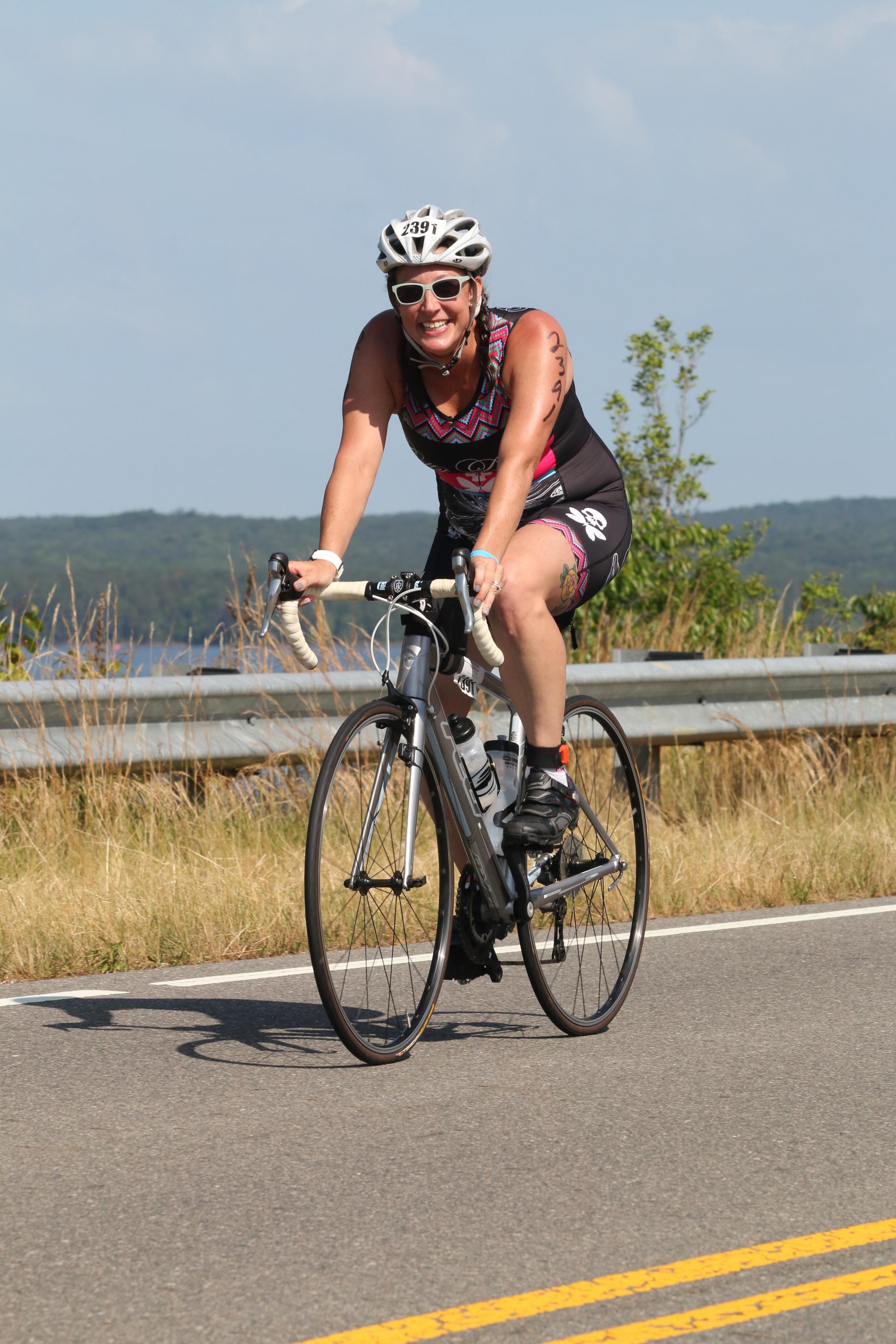 I finished the swim in the top third of my age group (and that would be the last time I enjoyed that feeling!) With my swim time closer to 45 minutes I knew I would get out of transition and onto my bike in well under an hour so I took my time in transition. I ate a Honey Stinger waffle and got ready to ride. A generous slathering of sunscreen from a volunteer and I was off!