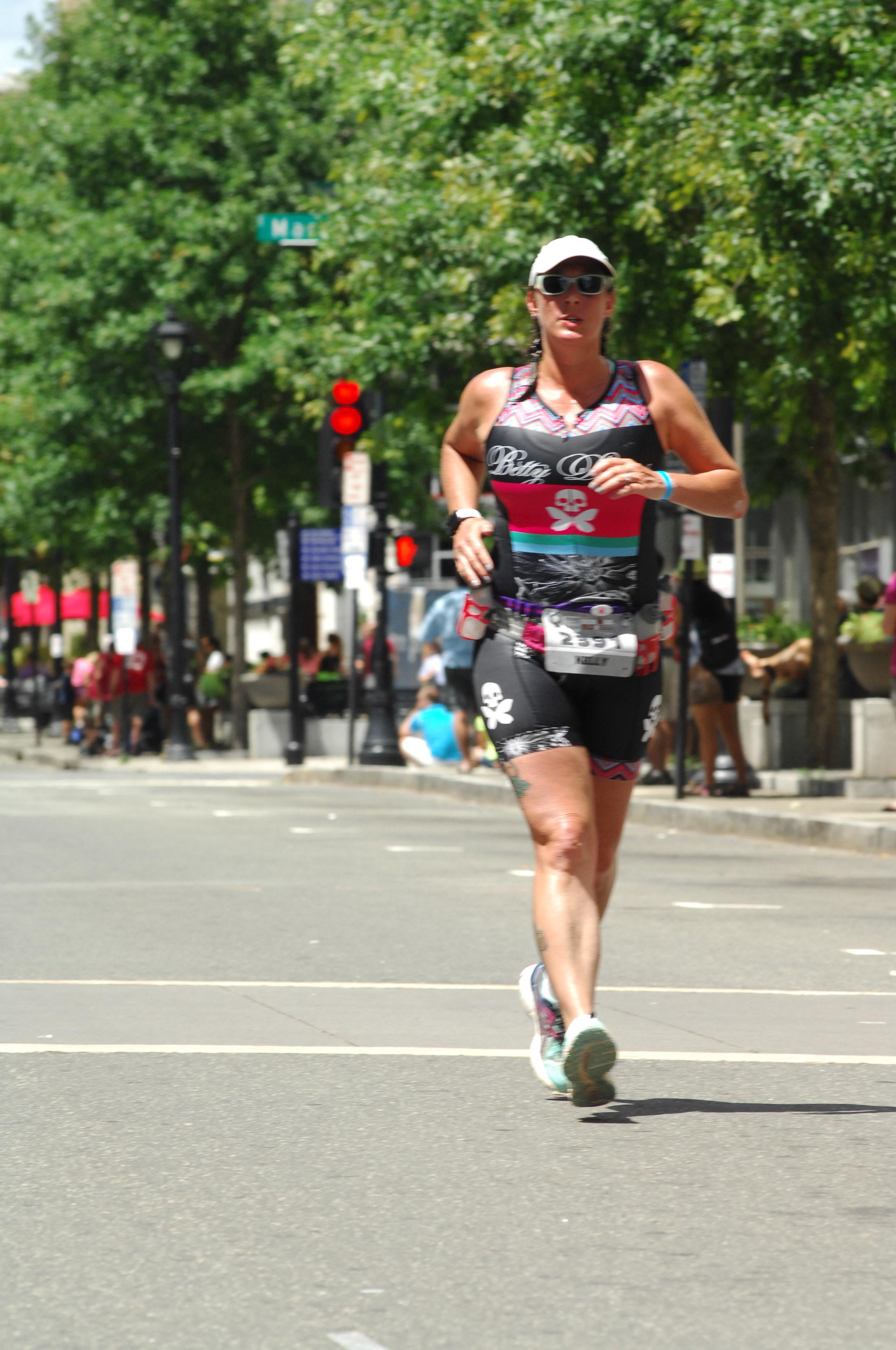 Instead of giving me the “Get away from me” eyes, she laughed. You guys know that laughing just encourages my bad behavior. I don’t know that we ever decided to finish the next ten miles together. It just happened. One of us would start to feel good and say “We run to the next three stop lights and we walk through the aid station?” and off we would go. We talked triathlon and kids and labor and laughed and drank Gatorade and squeezed ice water on ourselves for the next two hours. She’d missed setting a new PR and decided not to kill herself. I was feeling dangerously dehydrated and just avoiding getting spotted by a medic so we made a good pair.