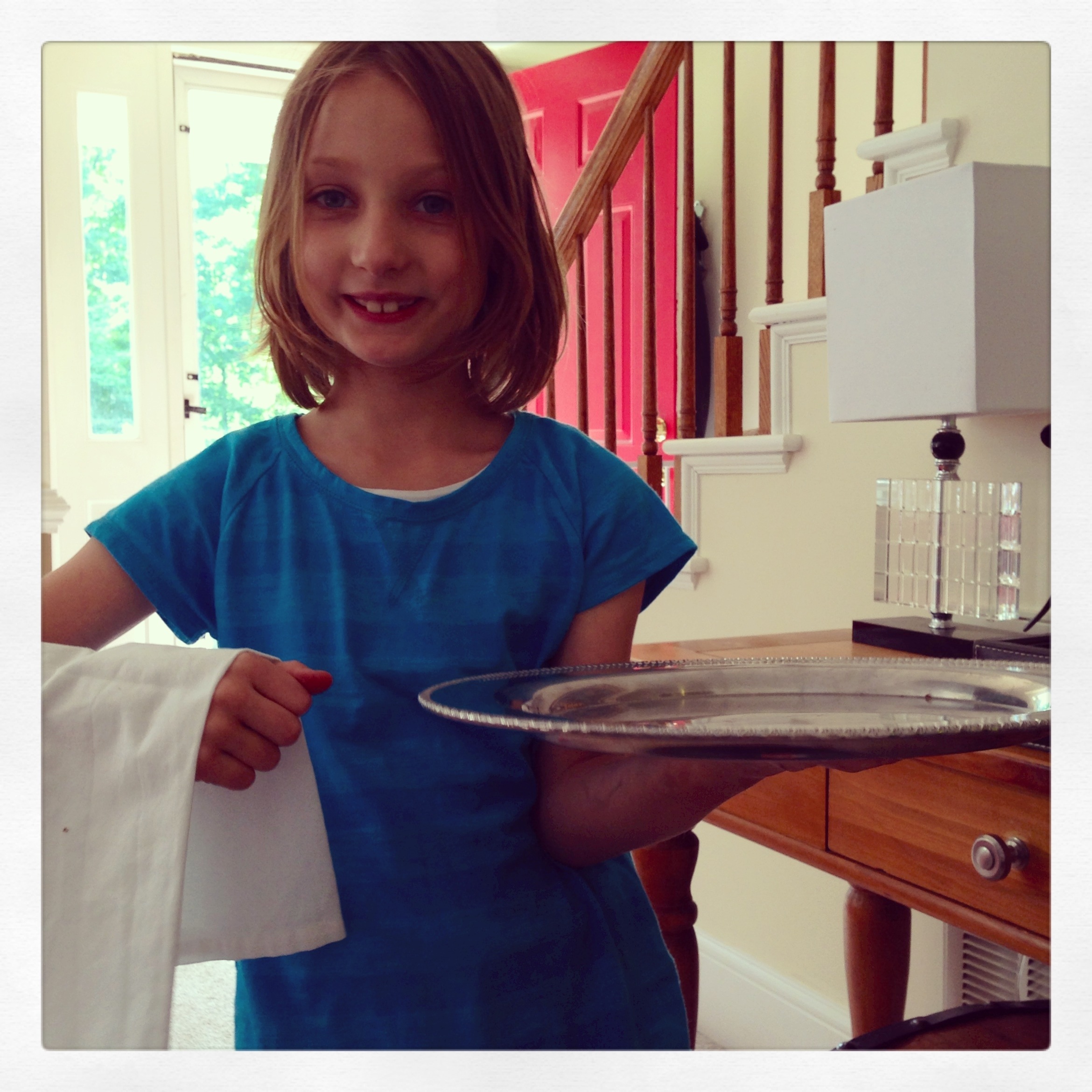 She practiced waiting tables.  20130508-080023.jpgShe offered to make me a “fancy drink” but I did some soul searching and decided that even if the baby is asleep in your lap that is not a good enough reason to teach your 7-year-old how to make a gin and tonic.  20130508-080012.jpgMQD came home and brought sushi from him (who knew there is a Kelly roll?) and we opted to play outside for a bit before we ate dinner.