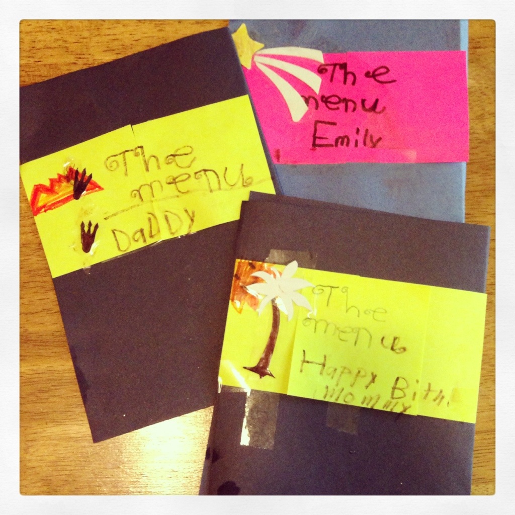 I had some time with my mini-me – 20130508-080053.jpgAnd MQD spent some time with his. 20130508-080033.jpgEm sweetly offered to chase Lucy around for a bit so MQD could make faces at me while I tried to take a picture of him.20130508-080046.jpgEventually it was time for dinner.  I put my phone away (gasp) so my last picture for a while was a quick snap of our menus. (On the inside they said only: sushi. Em came to the table and asked us what we would like and rolled her eyes as we opened the menu and hemmed and hawed before selecting “the sushi.” Note the custom menus – “Mom likes the beach and Dad likes monsters.”)20130508-080059.jpgWe had sushi and red velvet cake from the little bakery in town. We had sushi on our honeymoon for my birthday.  We had red velvet cupcakes at our wedding and MQD sweetly ordered a small one to be delivered to our room as we celebrated my birthday with champagne in the middle of the afternoon.   I felt special the entire time MQD and I were on our honeymoon.  The intoxicating combination of the “just married” glow and the chance to spend time just the two of us for the very first time created an atmosphere that we might never truly recreate.  But for me, on my birthday, MQD tries.