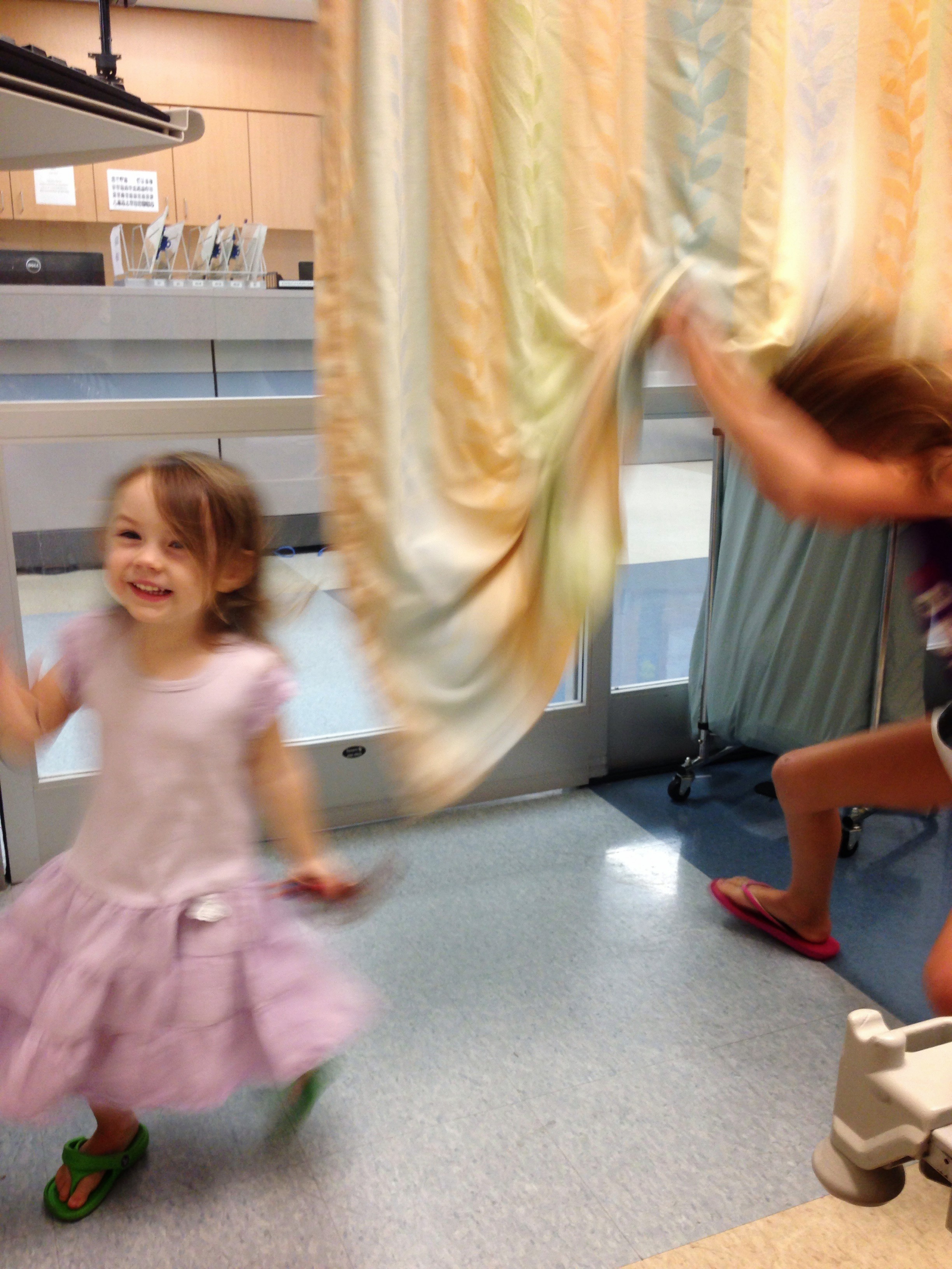 On the other side of the curtain in our emergency room the girls were giggling, playing hide and seek. I’d like to pretend that they were both blissfully unaware of the tension that had been in the room but Emily is too smart.
